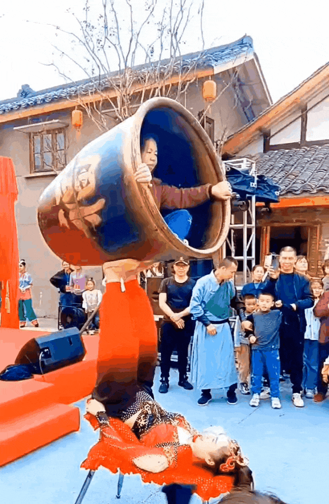 表演者躺在特制道具上,双腿稳稳举起巨大的福缸。只见福缸在其脚上飞速旋转、灵活翻腾,或直立、或倾斜,做出各种惊险动作,以独特的技艺为春节增添别样欢乐。