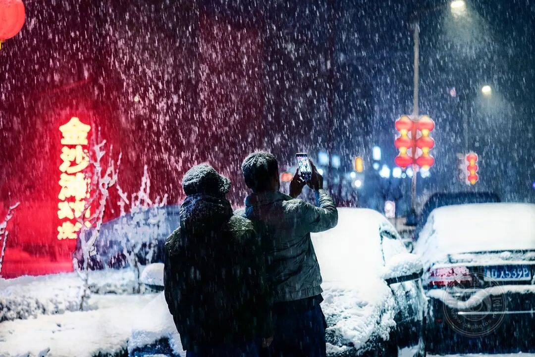 2021年2月24日晚9时拍摄于邯郸市成安县向阳北街,入冬来突降的第一场大雪,让人兴奋不已,纷纷走上街头嬉戏玩闹,图为两个年轻人在大雪中摆姿势。