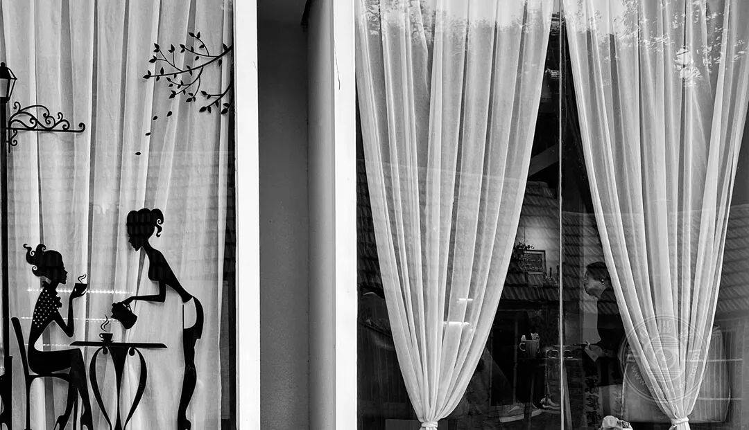 2021年10月26日拍摄于山东省威海市里口山,咖啡屋窗外映出的真假两组人像的场景。器材:苹果11。