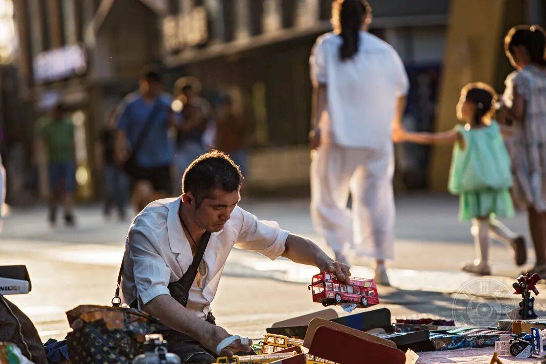 2025年7月26日拍摄于合肥。夕阳下,街头摆摊人专注摆弄玩具,背景行人穿梭,平凡场景藏着生活烟火与温情。