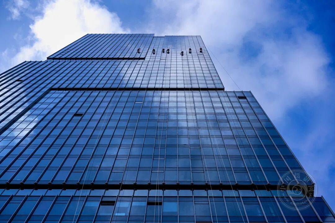 2025年6月的一天拍摄于苏州某酒店,楼高200米,高耸入云。几个工人师傅冒着生命危险在清洗楼面。玻璃幕墙映衬着蓝天白云,天空与楼面浑然一体,师傅们宛如在云端工作。此景壮观美丽,此情震撼感人!