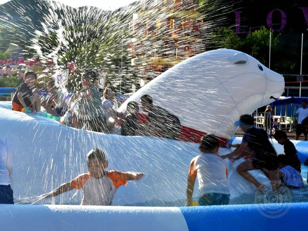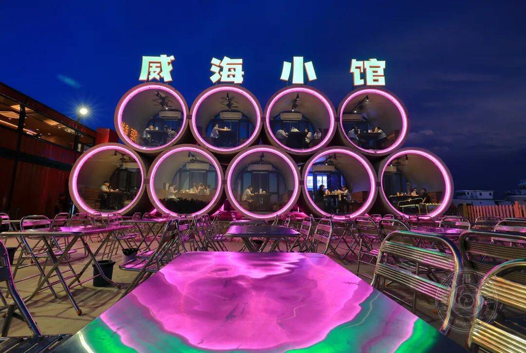 2023年7月摄于山东威海市,傍晚时分,游人在用水泥管形状的餐厅用餐,灯光梦幻,氛围迷人。