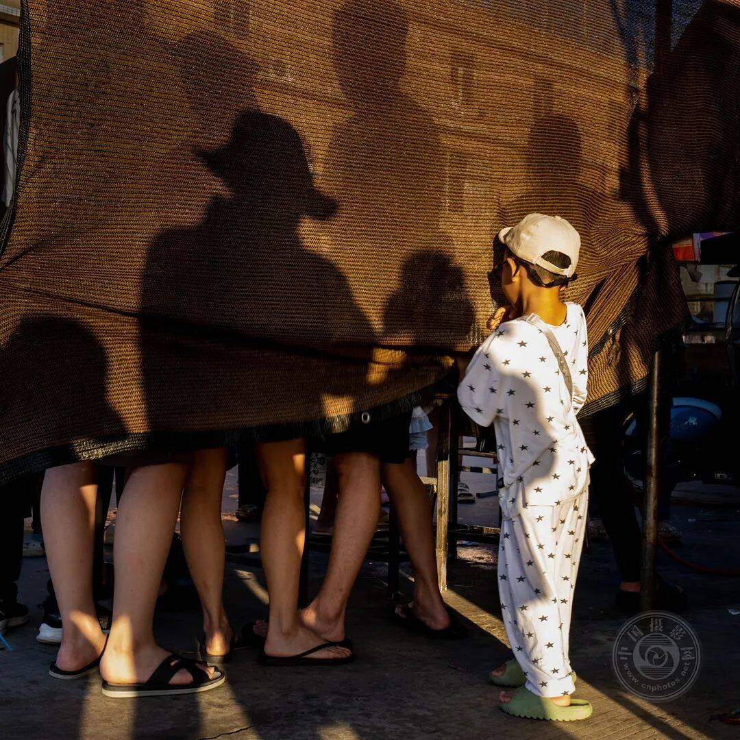 2025年8月16日拍摄于广东惠来,傍晚惠来的澳角码头,一小男孩站在遮阳网的后面与前面人物的影子、脚,构成了一幅耐人琢磨画面。