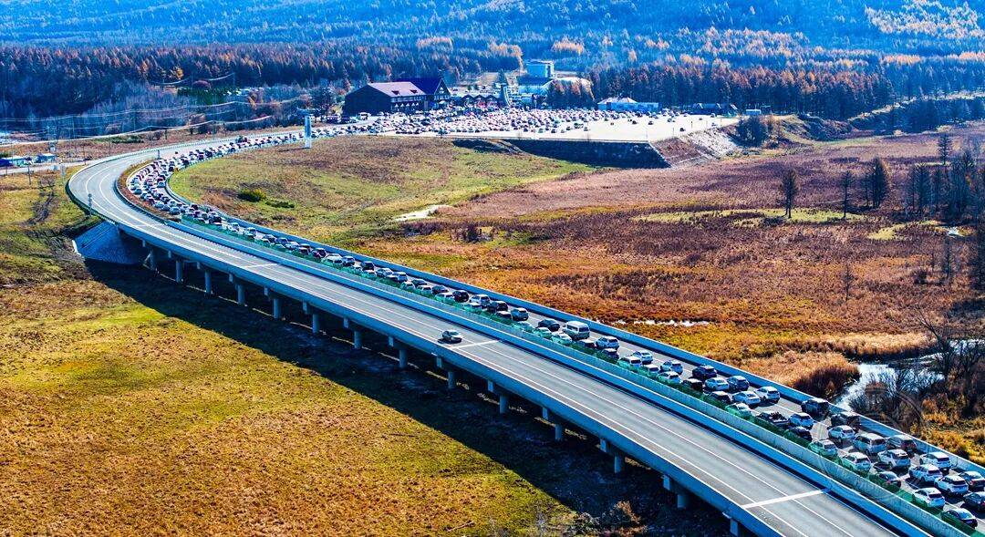 2024年10月4日拍摄于内蒙古阿尔山国家森林公园,时值十一黄金周来阿尔山旅游欣赏金秋美景等待入园的车流。