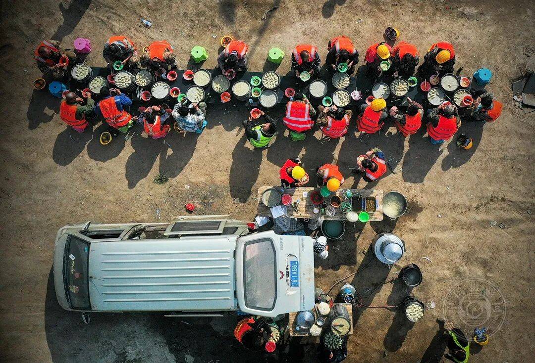 2021年10月29日拍摄于沈阳市方大医院建筑工地,用木板搭建了临时餐桌,建筑工人从工地走来,身穿各种颜色服装和安全帽在工地上吃午餐的情节,构画成了工地多彩风景线。